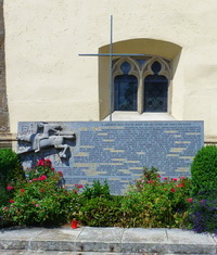 Freistehende Namenstafel mit dem Relief eines Reiters mit Schwert an der Kirchenaußenwand.