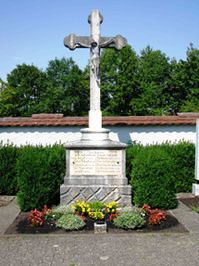 Auf dem Sockel der Statue des Gekreuzigten, die auf dem Friedhof steht, sind die Opfer beider Weltkriege verzeichnet