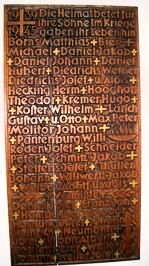Gedenkstein: Verzeihen sich Feinde von Gestern und werden Freunde von Morgen, so sind diese Toten nicht umsonst gestorben. Zum Gedenken der Toten und Vermissten des 2. Weltkriegs. Gedenktafel: Die Heimat betet für ihre Söhne. Im Kriege 1939-1945 gaben ihr Leben hin: (Namen)