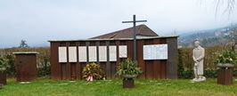 die mit Bruchsteinen abgedeckt sind. Im Zentrum ein Metallkreuz und seitlich eine freistehende Soldatenstatue.
