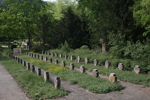 Im Trierer Ortsteil Ehrang, auf dem Waldfriedhof, drei Reihen von Steinkreuzen, in der Mitte ein Hochkreuz, seitlich zwei