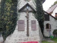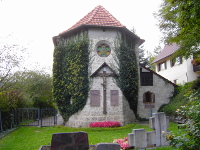Kirche mit Friedhof / Rückseite der Kirche ein großes Kreuz mit Inschrift (Vater in deine Hände empfehle