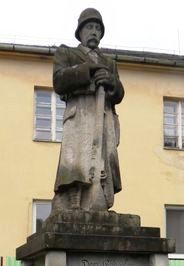Ortsmitte: Soldat, auf sein Gewehr gestützt; Namenstafeln auf drei