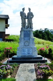 Statue zweier sich die Hand reichende Soldaten auf mehrstufigen Sockel am