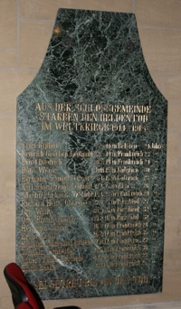 Aus der Schloßgemeinde starben den Heldentod im Weltkriege 1914 – 1918: (Namen) Sei getreu bis an den Tod.