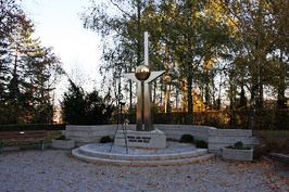 Wieselburg (Frieden), Bezirk Scheibbs, Niederösterreich, ÖsterreichPLZ 3250 Bei der Kirche; runder Platz, dahinter halbkreisförmige Mauer, auf der runden Fläche dreieckiger Sockel mit Inschrift, darauf Metalldenkmal mit Weltkugel