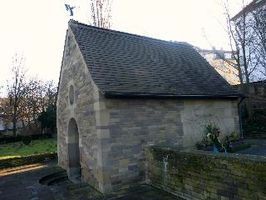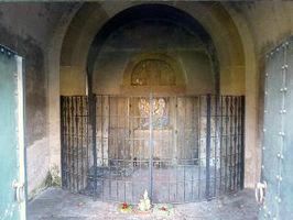 Kapelle auf dem Friedhof – davor ein Gräberfeld. In der Kapelle befindet siche im hinteren Teil eine Holztür, wenn diese