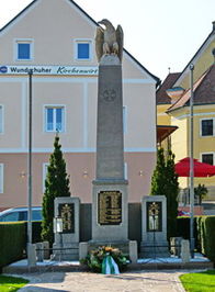 Stele gekrönt mit Adler flankiert von zwei freistehenden Namenstafeln neben der Kirche.
