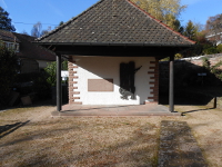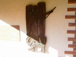 Alter Friedhof / Kleine Halle mit Überdachung Steintafel an der Außenmauer der Halle angebracht. Mit den Namen der gefallenen der Kriege WK 1 und WK 2. Daneben ein Mann in der rechten Hand ein Kreuz und in der linken Hand eine Lanze, die Schräg nach unten in den Mund eines Drachen zeigt.