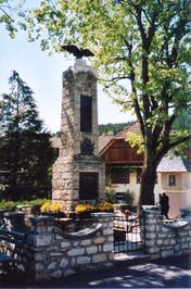 Eingezäunter Quaderförmiger Sockel mit Obelisk. Tafeln mit generellen Inschriften und den Namen der Gefallenen,