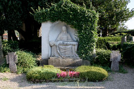 Im Friedhof: Denkmal (ohne Namen) mit Steinrelief "Mutter mit Verstorbenem", im Sockel Inschrift, seitlich zwei Soldatengräber; zusätzlich Hinweise zu Soldaten von privaten Gedenksteinen