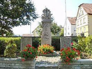 Das Kriegerdenkmal besteht aus Muschelkalkstein. In der Mitte eine verzierte Steinsäule mit dem berittenen Hl. Georg als oberen Abschluss. Links und rechts daneben zwei Namensplatten. Die Namen der Gefallenen des 1. Weltkrieges befinden sich in einer Kartusche auf der Vorderseite der Steinsäule, während die Namen der Teilnehmer am Feldzug 1870-71 und dem 1. Weltkrieg auf der Rückseite eingeschlagen sind. Ergänzende Daten stammen von Sterbebildern aus der Sammlung Liepert (www.liepert-arnstein.de)