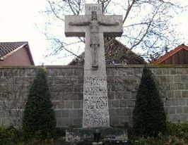 Auf dem Friedhof steht ein großes Steinkreuz auf dem die Namen der Opfer eingeschlagen sind.