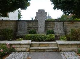 Vor einer halbrunden Mauer steht ein Steinkreuz mit zwei Gedenkplatten.