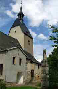 Im Innenraum der verschlossenen Kirche sind Gedenktafeln für den 2. Weltkrieg angebracht.