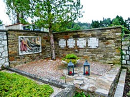 Kriegsgrab mit Bruchsteinmauer und einem Relief des Hl. Georg im Zentrum des Friedhofs.