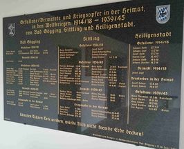 Gedenktafel: Gefallene / Vermisste und Kriegsopfer in der Heimat, in den Weltkriegen 1914/18 – 1939/45 von Bad Gögging, Sittling und Heiligenstadt (Namen)