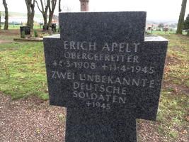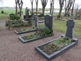 Es gibt auch noch Kriegsgräber von zwei unbekannten deutschen Soldaten vom 2. Weltkrieg. In blauer Schrift Ergänzungen aus www.volksbund.de/graebersuche