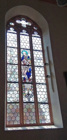 Denkmal im Friedhof bei der Kirche St. Bartholomäus. Zwei Steinkreuze, die in der Mitte verbunden sind. Kirchenfenster mit einer Mariendarstellung und Gedenkinschrift für die Gefallenen des 1. Weltkrieges.