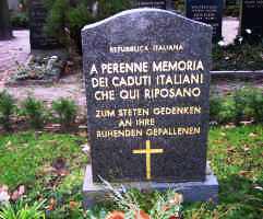 Italienischer Gedenkstein: REPUBLICA ITALIANA A PERENNE MEMORIA DEI CADUTI ITALIANI CHE QUI RIPOSANO. Zum Steten Gedenken an ihre hier ruhenden Gefallenen.