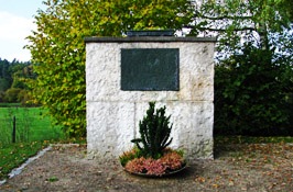 Eine Feuerschale steht auf dem großen Steinblock. Eine Platte trägt die Namen und Todesjahr der Opfer beider Weltkriege.