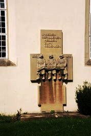 An der Kirche befindet sich ein ca. 3,5 m hohes Steinrelief. Es zeigt drei Soldaten, die einen Gefallenen tragen. Darunter befinden sich die Namensplatten. Etwas abseits der Kirche vor der alten Schule steht ein Gedenkstein für 1864, 66, 70/71 ohne Namen.