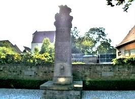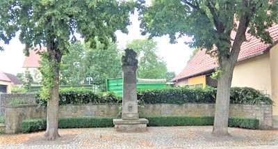 Viereckige Steinsäule, auf einem Podest, mit einer Figur des Hl. Georg als Abschluss. An der halbkreisförmigen Wand dahinter sind Namenstafeln angebracht.