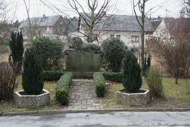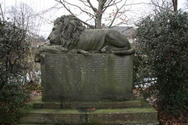 Sarkophag mit darauf liegendem verletztem Löwen. Neben der Kirche unmittelbar an der Kreisstraße