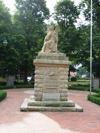 Standort Ortsmitte. Gepflegte Grünanlage vor St.Michael, aus hellem Sandstein gemauerte, wuchtige Säule, links und rechts schwarz polierte Marmortafeln, Daten eingraviert und silbergrau hervorgehoben (1. Weltkrieg), kreisförmig um die Säule 5 gemauerte kleinere Stelen, darin jeweils eingelassen Tafeln in schwarzem Marmor mit den Daten (2. Weltkrieg) ebenfalls silbergrau hervorgehoben, Säulenfront helle Sandsteintafel mit Teilrelief eines Stahlhelms im Eichenlaubkranz, unter der Inschrift die Daten des Krieges 1870/71