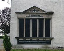Fünf Gedenktafeln an der ev.-luth. Kirche Caselwitz für die Gefallenen der Kirchgemeinde (Greizer Ortsteile Caselwitz, Dölau, Moschwitz, Obergrochlitz, Rothenthal und Untergrochlitz)