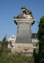 Denkmal mit sitzendem Soldaten mit Schwert (dieser aus Sandstein – verwittert) unmittelbar neben der Dorfstraße geschaffen von W. Luckner aus Culmitzsch.