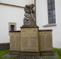 des 1. Weltkriegs und oben darauf ein knieender Soldat. Stele links und rechts nach hinten versetzt mit den