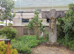 Steinkreuz mit Korpus; dahinter an der Friedhofsmauer sind zwei Steintafeln angebracht.