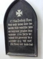 Findling mit (neuer) Tafel vor der Kirche Drei Tafeln in der Kirche und ein Grabstein auf dem Friedhof