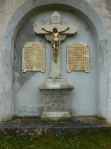 1. Weltkrieg: Gedenkstätte an der Außenmauer des Friedhofs. In einer Nische ein steinernes Kruzifix. am unteren Kreuzschaft die Reliefdarstellung eines Helmes mit Blattlaubschmuck, flankiert von zwei Marmortafeln mit den Namen der Kriegstoten. Ehrenmale bei der katholischen St. Nikolaus Kirche; Kruzifix mit Namentafeln für den 1. Weltkrieg.