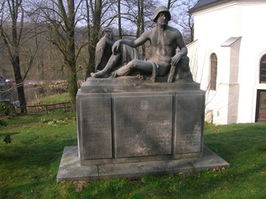 Auf dem Kirchhof ein liegender Steinquader. Auf diesem liegt die nackte Skulptur eines Kriegers und sitzt ein Adler. Der untere Teil der Widmung , fünf Namen, sowie einige Einzelangaben/Daten sind nicht mehr leserlich.