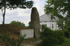 Findling vor der Kirche an der Durchgangsstraße Richtung Pöllwitz. Daneben Platte für die Opfer des 2. Weltkrieges. Zwischen beiden Feldstein mit erhabenem Eisernen Kreuz.