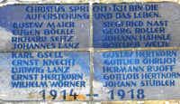 Ein Kirchenfenster trägt die Inschrift sowie die Namen der Gefallenen und Vermissten des 1. Weltkriegs, die vom Innenraum aus zu lesen sind.