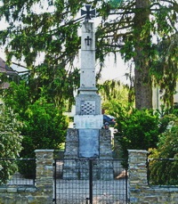Stele gekrönt mit Tatzenkreuz und eingefriedet mit Metallgitterzaun am Dorfplatz.
