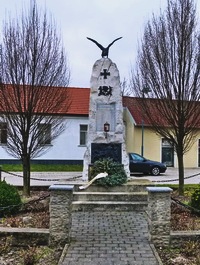 Säule gefügt aus Natursteinen auf mehrstufigem Sockel mit Ketten eingefriedet am Dorfplatz.