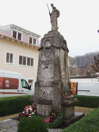 Steinsäule in der Ortsmitte, an der Nordseite der Pfarrkirche Die Namen der Gefallenen sind gesondert auf Marmortafeln an der Kirchennordwand angebracht