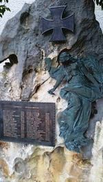 Felsblock mit Namenstafel und Relief eines Engels und einem Eisernen Kreuz; Gedenktafel für die Gefallenen des