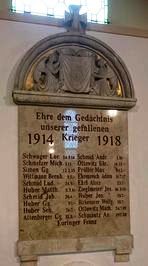 1. Weltkriegs in der Kirche; Ehrentafel für die Gefallenen und Kriegsteilnehmer des 2. Weltkriegs im Gasthof Riedmeier;