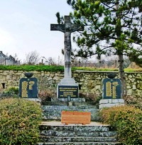 Großes Kruzifix flankiert von freistehenden Gedenktafeln am Friedhof.