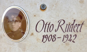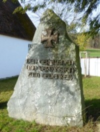 Gedächtnisstätte rechts am Eingang zum Friedhof. Großer Monolith mit einem metallenen Eisernen Kreuz, darunter die Widmung. Das Denkmal enthält keine Namen. Namen für beide Weltkriege aus dem Buch „Mahnmale für den Frieden“.