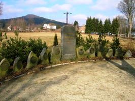 größeren Stein mit Inschrift, sowie jeweils rechts und links sechs kleineren mit Namenstafeln der Gefallenen
