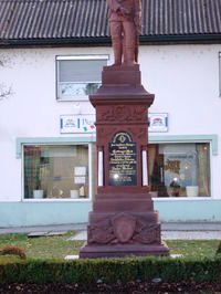 Gedenksäule, auf getrepptem Sockel, im Säulenschaft schwarze Marmortafeln mit Gefallenendaten auf allen vier Seiten, Daten goldfarben ausgefüllt, auf der Säule, Soldatenfigur in bayr. Uniform mit Raupenhelm,
