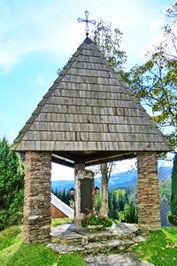 Metalltafel, geschützt durch ein dreieckiges, pyramidenförmiges, schindelgedecktes, von drei Bruchsteinsäulen getragenes Dach nahe der Kirche.