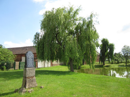 Gravierter Inschriftenstein auf Steinsockel auf einem Spielplatz neben dem Löschteich im Ortskern.