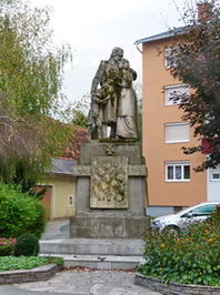 Pyramidenstumpf mit Spuren einer nicht mehr vorhandenen Zusatztafel, gekrönt mit der Statuengruppe eines Soldaten mit Frau und Kind am Postplatz.